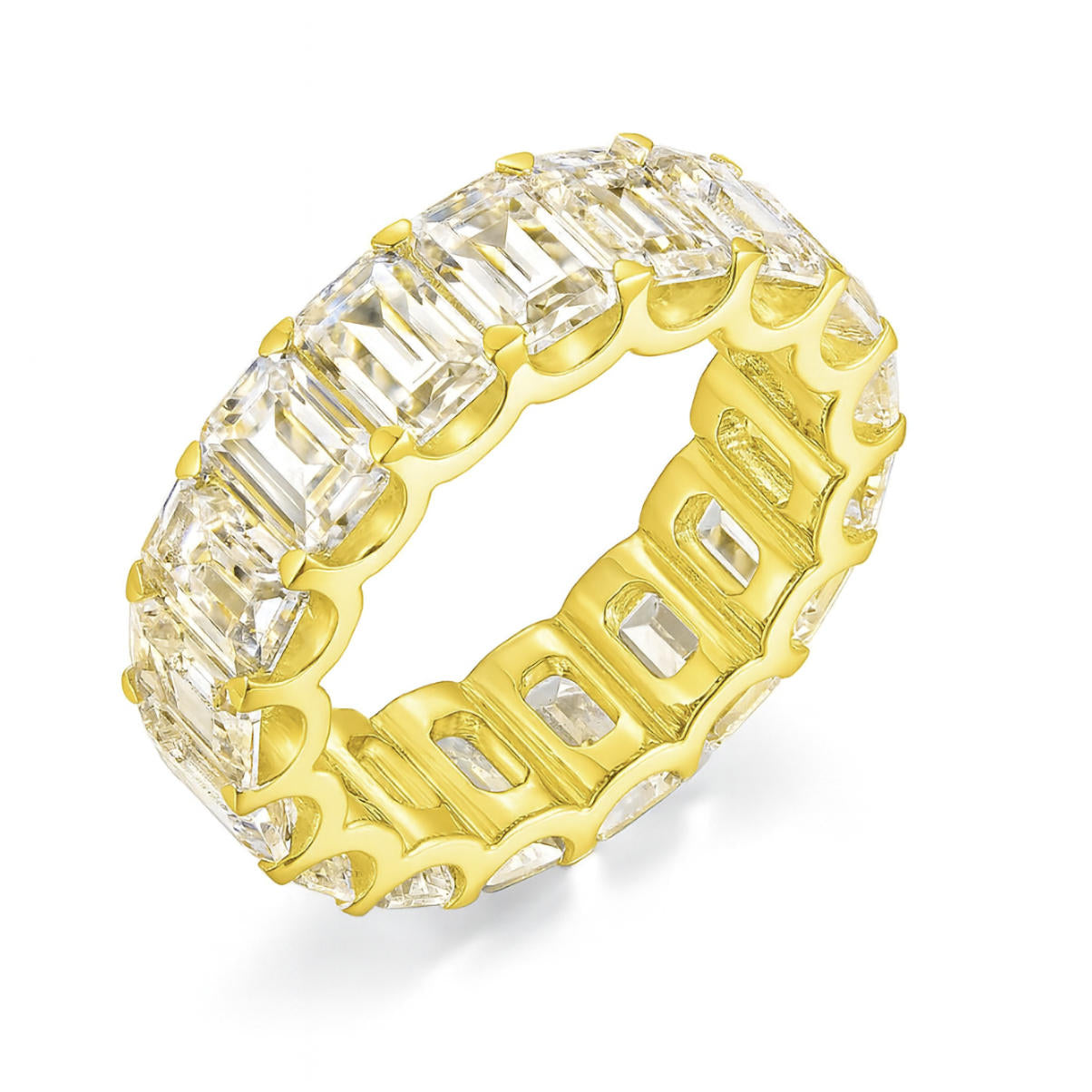 Bold, timeless, and endlessly radiant. This emerald cut diamond eternity ring makes a powerful statement of everlasting love. Featuring approximately 13.60 carats total weight of hand-selected emerald cut diamonds, each stone is meticulously set in sleek white gold for a seamless flow of brilliance around the entire band. The refined silhouette of emerald cut diamonds offers a captivating play of light, highlighting their elegant symmetry and sophistication. A striking symbol of commitment or a luxurious upgrade to any jewelry collection, this eternity band is designed to be treasured for a lifetime.