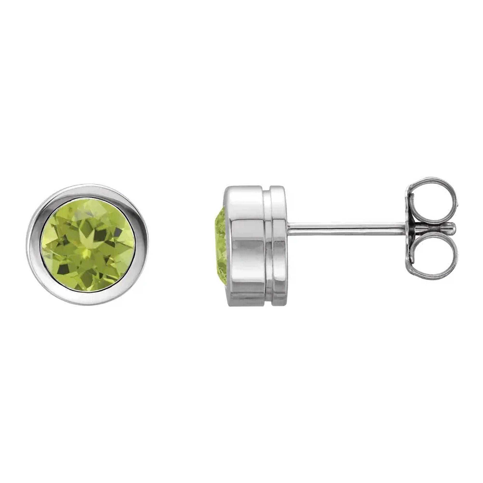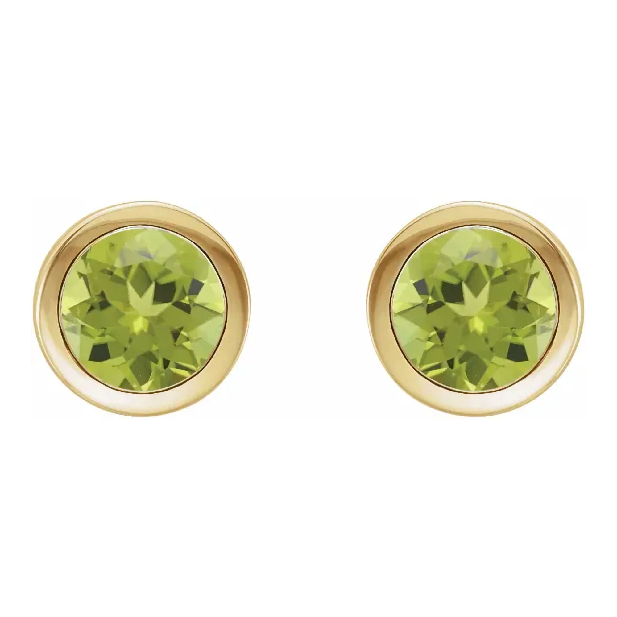 Brighten your look with the fresh green glow of these bezel-set peridot stud earrings, offered in your choice of 14K white or yellow gold. Each earring features a genuine round peridot, securely encased in a sleek gold bezel that enhances the gemstone’s vivid hue while providing a smooth, modern finish. Designed for everyday elegance, these studs are fitted with secure post-and-friction backs for comfortable wear. A perfect gift for August birthdays or anyone who loves the vibrant charm of peridot.