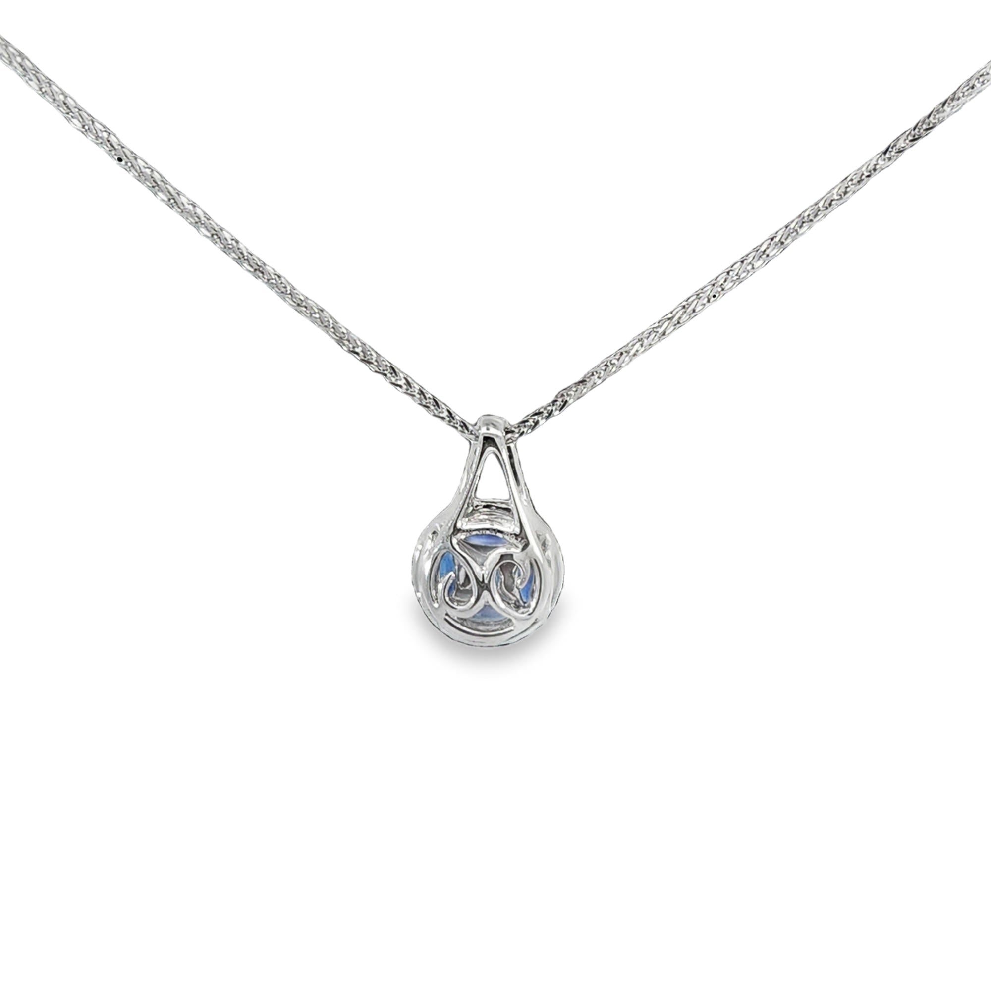 This exquisite pendant features a unique cluster of sapphires and diamonds, combining timeless elegance with a modern design. Four rich marquise-cut blue sapphires and one striking princess-cut blue sapphire, totaling 0.94 carats, form a captivating centerpiece. Surrounding the sapphires are 34 round brilliant diamonds with a combined weight of 0.16 carats, adding sparkle and sophistication. Crafted in 18k white gold, this pendant is a graceful symbol of luxury and hangs on an 18" inch 14k white gold chain. Perfect for both everyday wear and special occasions.