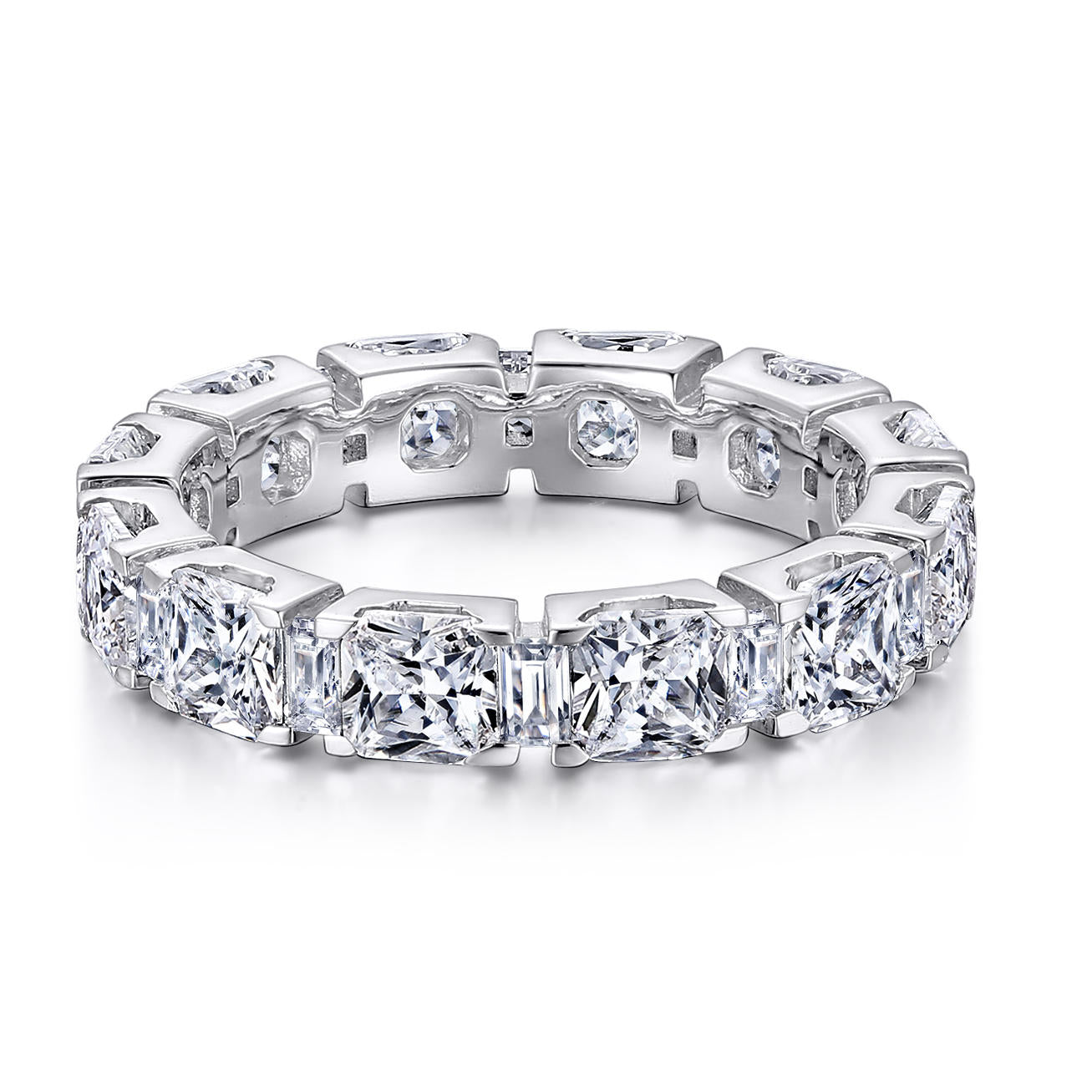 Radiating brilliance from every angle, this eternity band showcases approximately 5.40 carats total weight of cushion-cut and baguette-cut diamonds, alternating in a seamless continuous design. Each diamond is expertly set in polished white gold, creating a captivating play of sparkle and symmetry. A luxurious symbol of everlasting love, this band is an unforgettable choice for a wedding ring, anniversary gift, or statement piece that dazzles with timeless elegance.