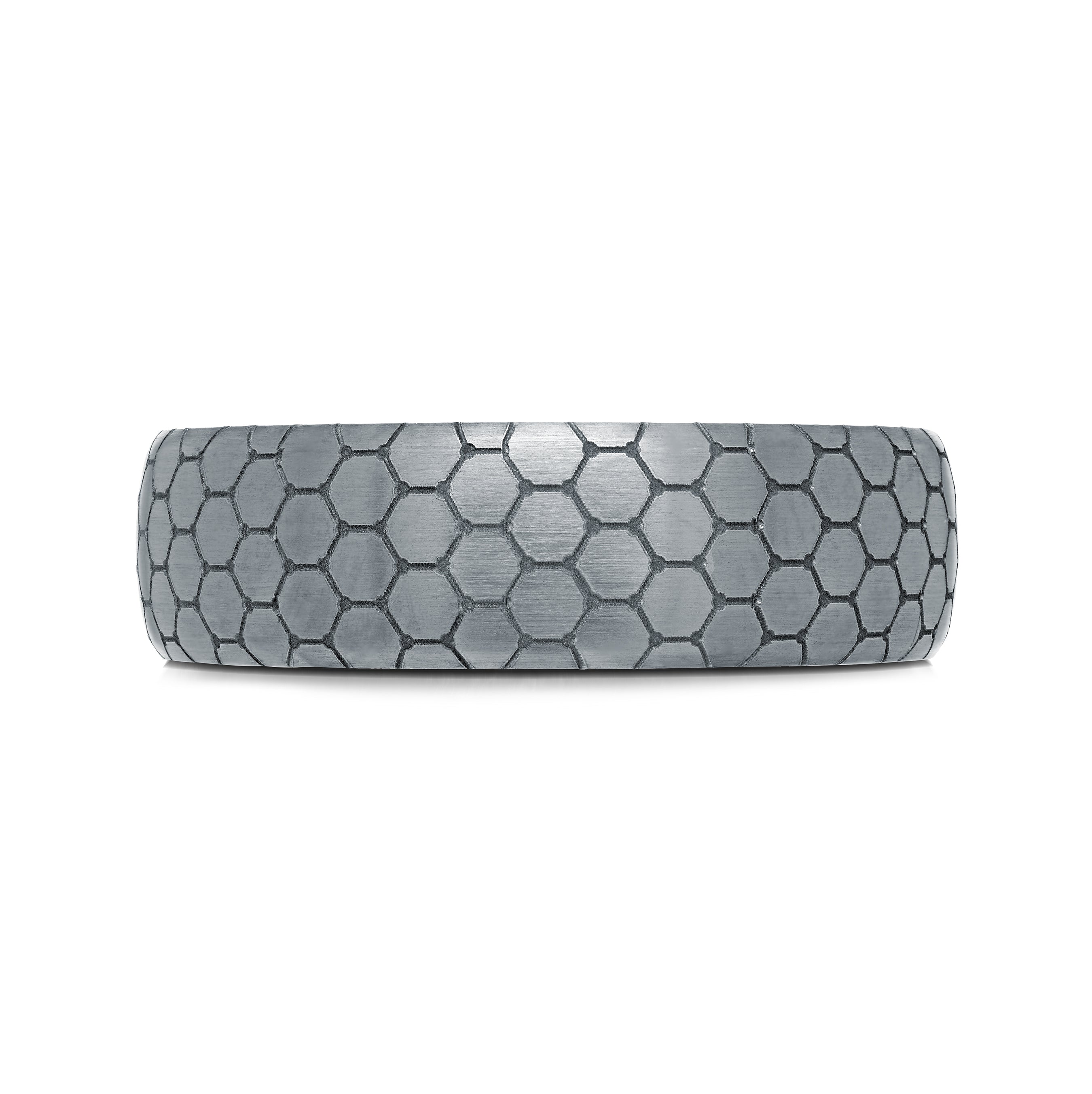This 6mm tantalum wedding band showcases a bold honeycomb-style hexagon pattern engraved across the surface. The repeating geometric design adds a sleek, tech-inspired flair to the ring, making it a standout choice for the modern groom. Crafted from ultra-durable and hypoallergenic tantalum, this comfort-fit ring combines rugged strength with contemporary design. A unique symbol of strength and structure. Perfect for someone who values design with a meaning.