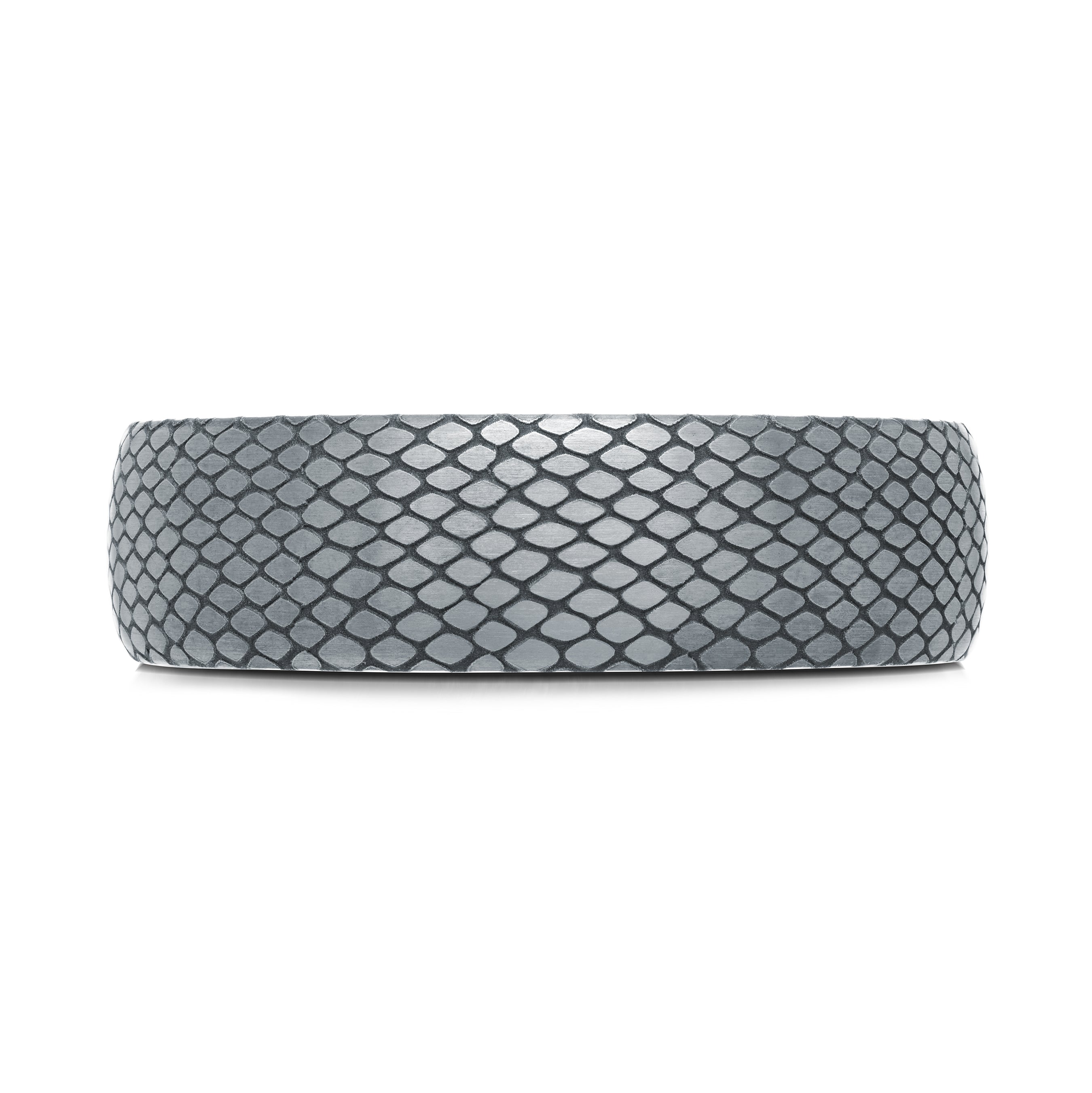 This 6.5mm tantalum wedding band showcases a distinctive hexagonal scale texture, delivering a bold and contemporary style. The intricate pattern mimics a mesh scales, offering a sleek and edgy appeal. With a brushed surface and comfort-fit interior, this hypoallergenic ring is crafted for durability and effortless wear.