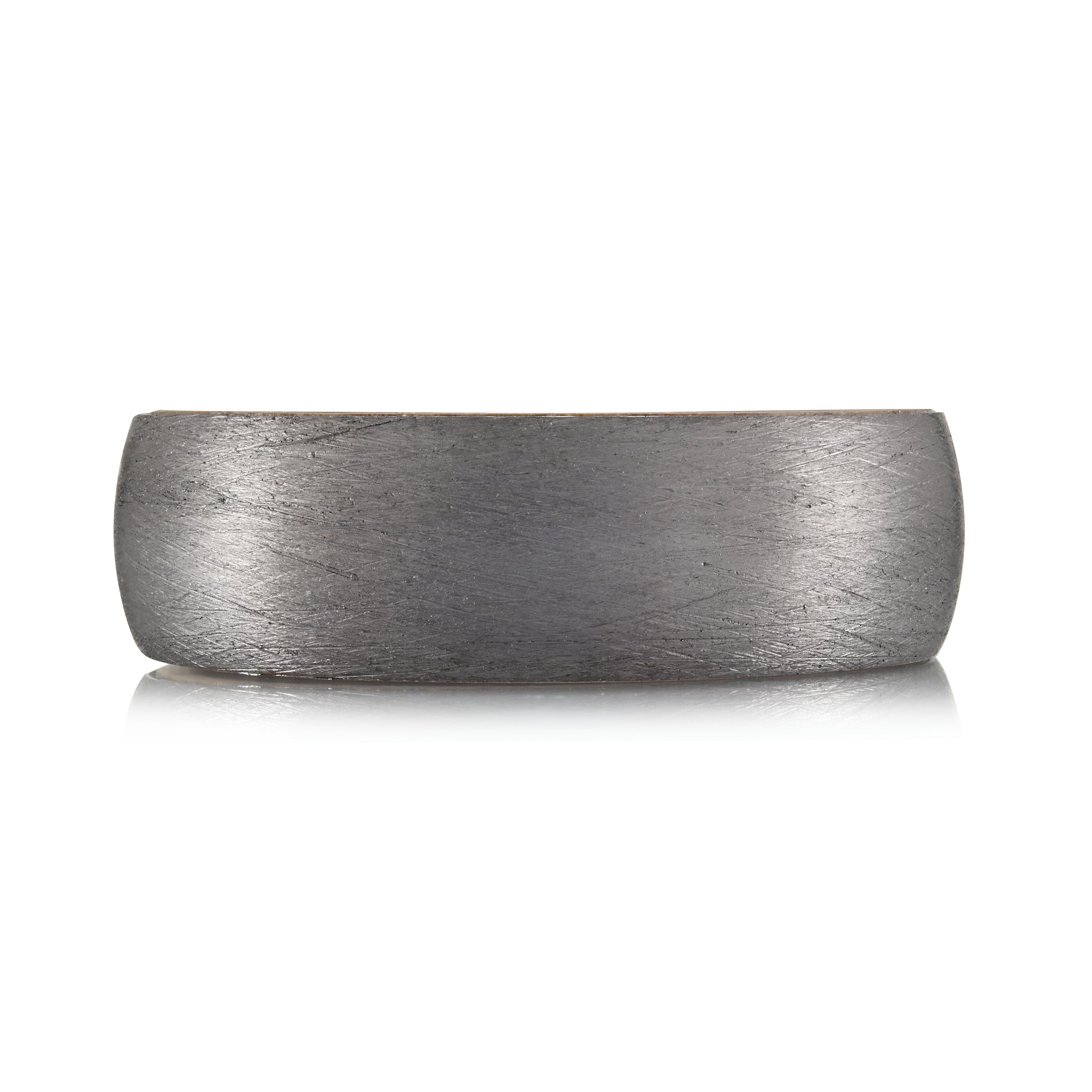A perfect fusion of nature and modern design, this 7mm men’s wedding band features a rugged brushed tantalum exterior paired with a warm natural wood interior. The contrast between the industrial gray metal and the organic wood grain creates a distinctive, earthy look. Durable yet lightweight, this comfort-fit ring is ideal for the groom who values both craftsmanship and character in his ring.