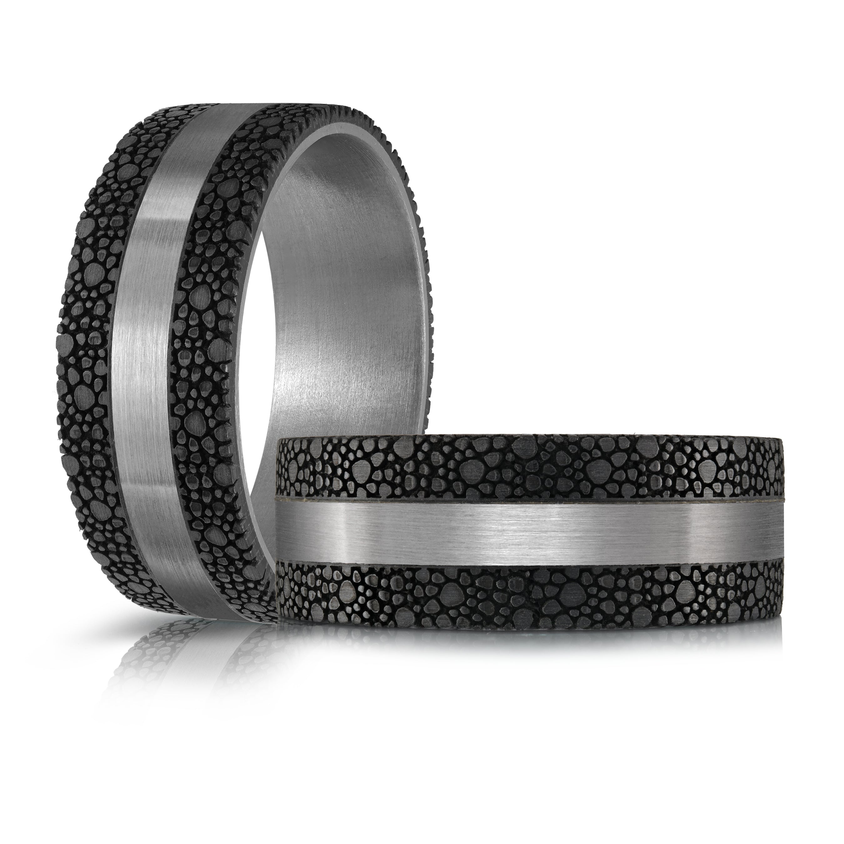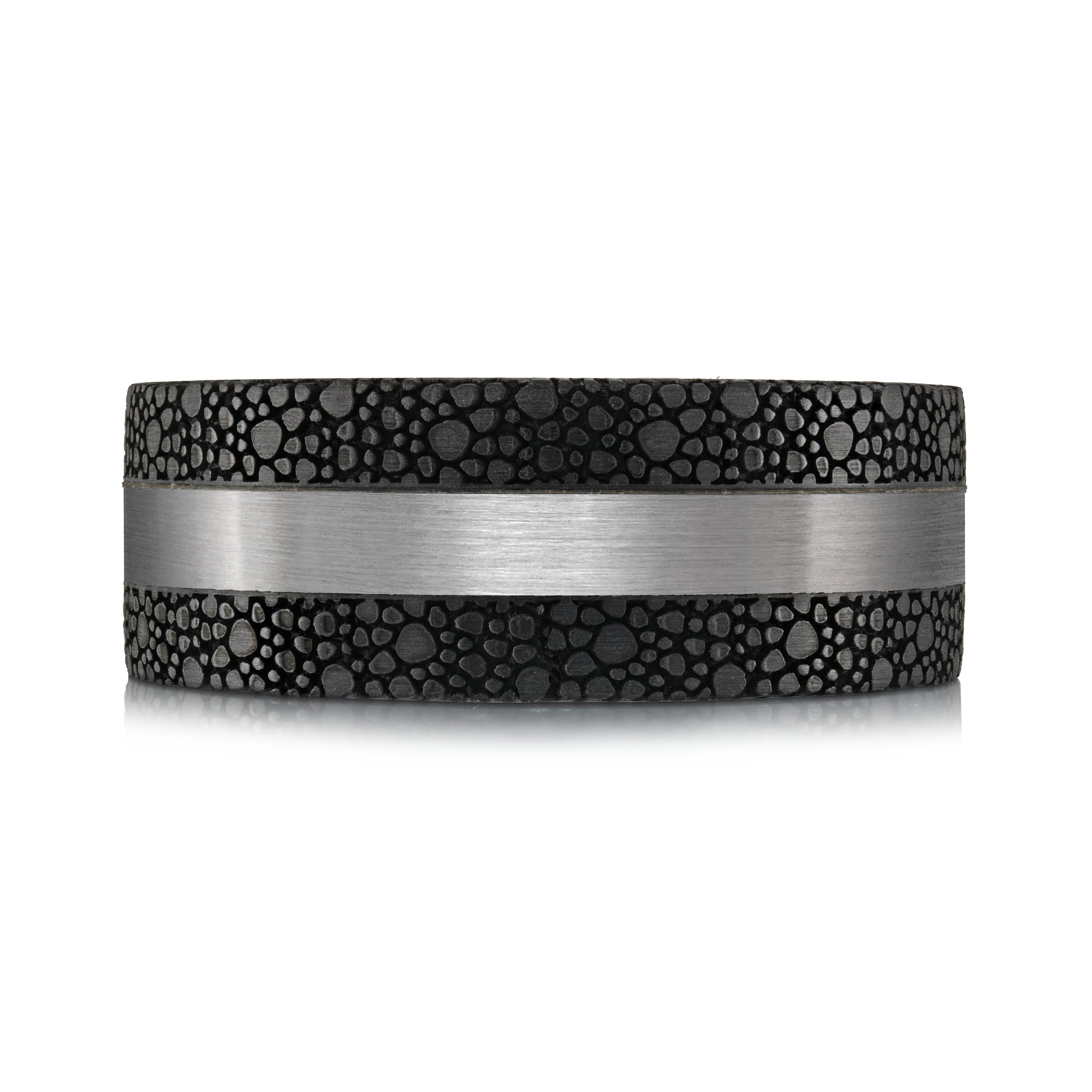 Bold and distinctive, this 8mm men’s wedding band features a striking combination of textures. The hammered black pebble-textured edges bring a rugged, edgy look, while the satin-brushed tantalum center offers a smooth contrast that enhances the design’s modern sophistication. Crafted for durability and comfort, this ring is the perfect choice for grooms seeking a ring as unique as their love story.