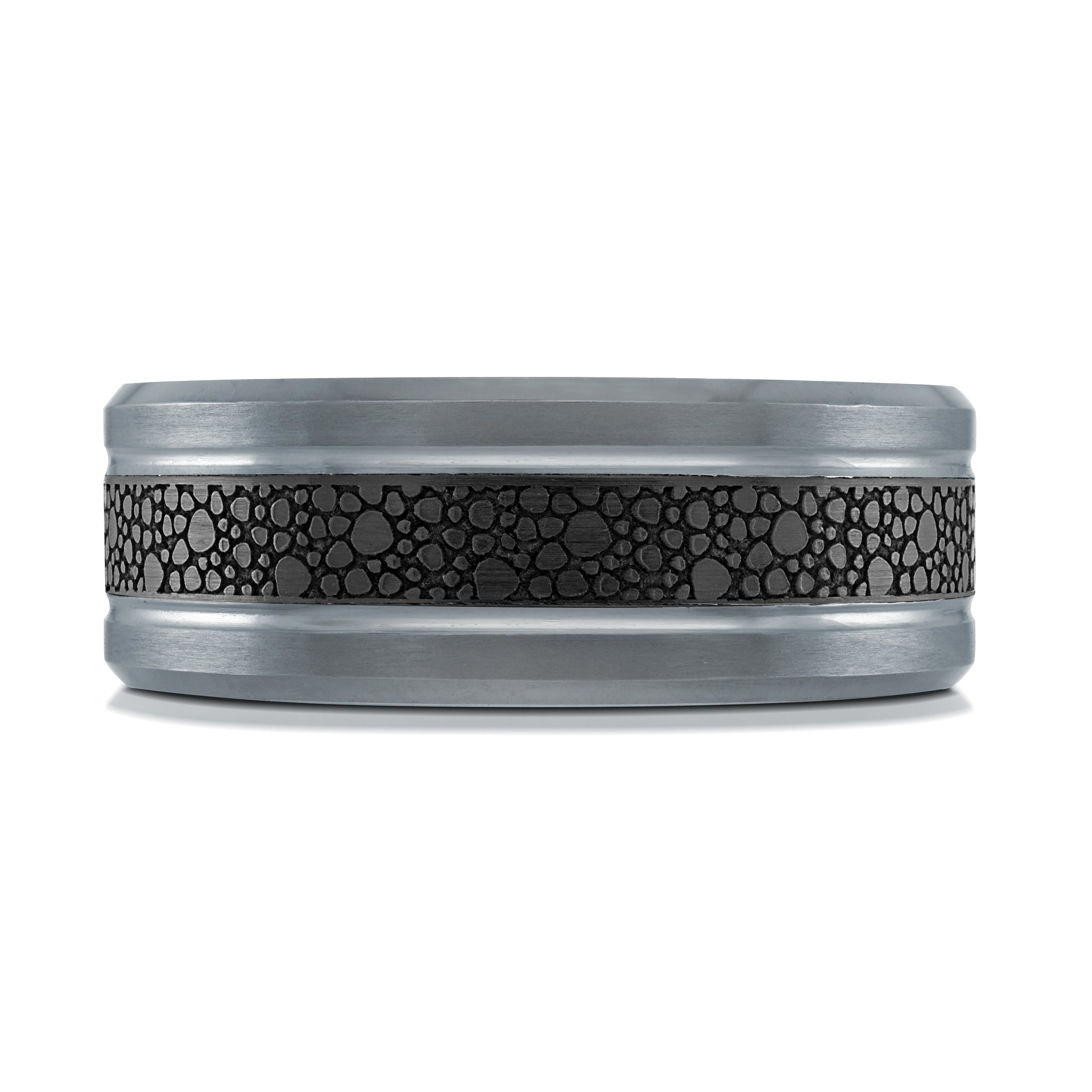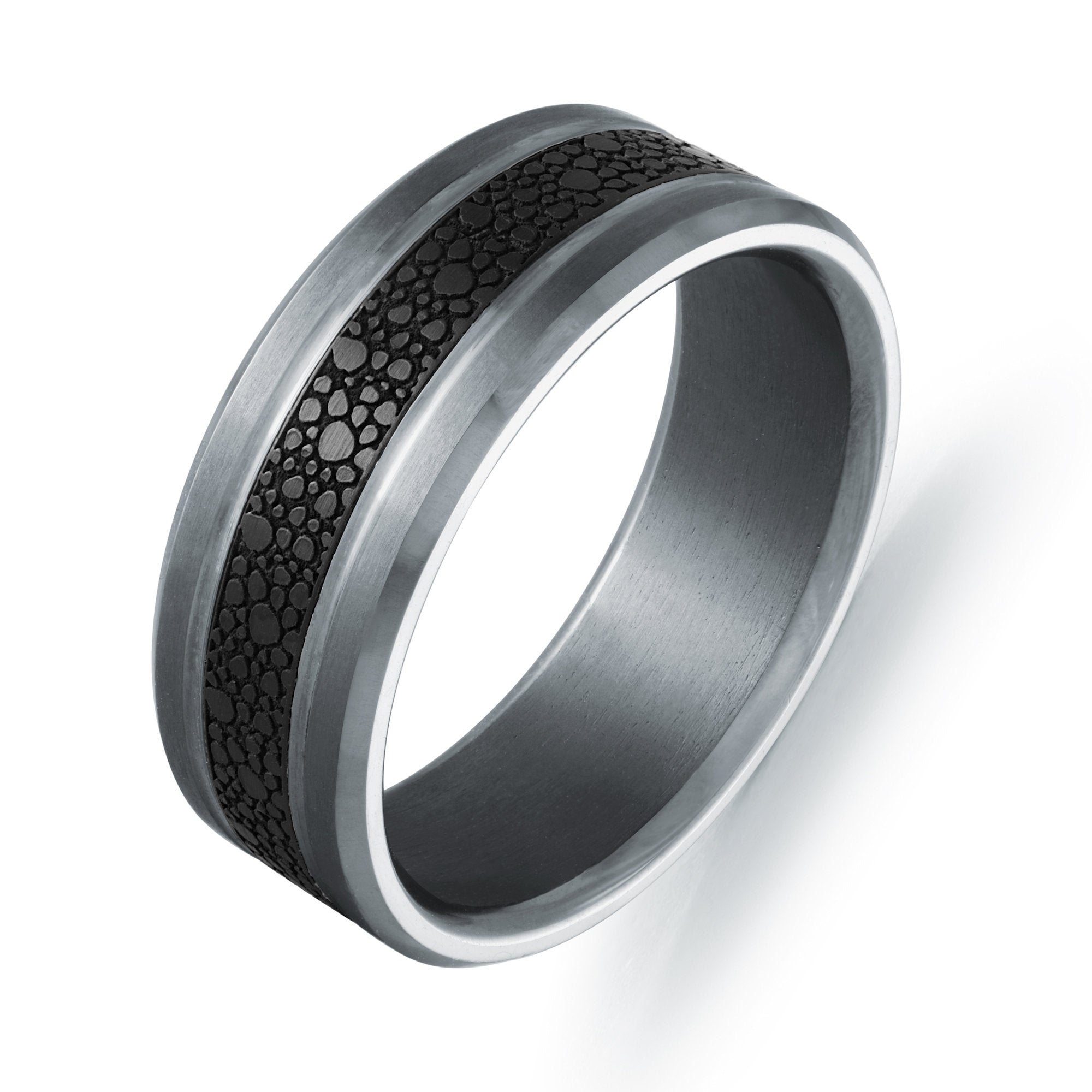 This 8mm men’s wedding band makes a bold statement with its unique textured black inlay, reminiscent of organic patterns like stingray leather or stone texture. Set within a durable brushed tantalum frame, the deep black inlay contrasts against the gunmetal-toned metal, giving it a rugged yet refined look. Finished with polished beveled edges and a comfort-fit interior, this ring combines cutting-edge style with long-lasting wear.