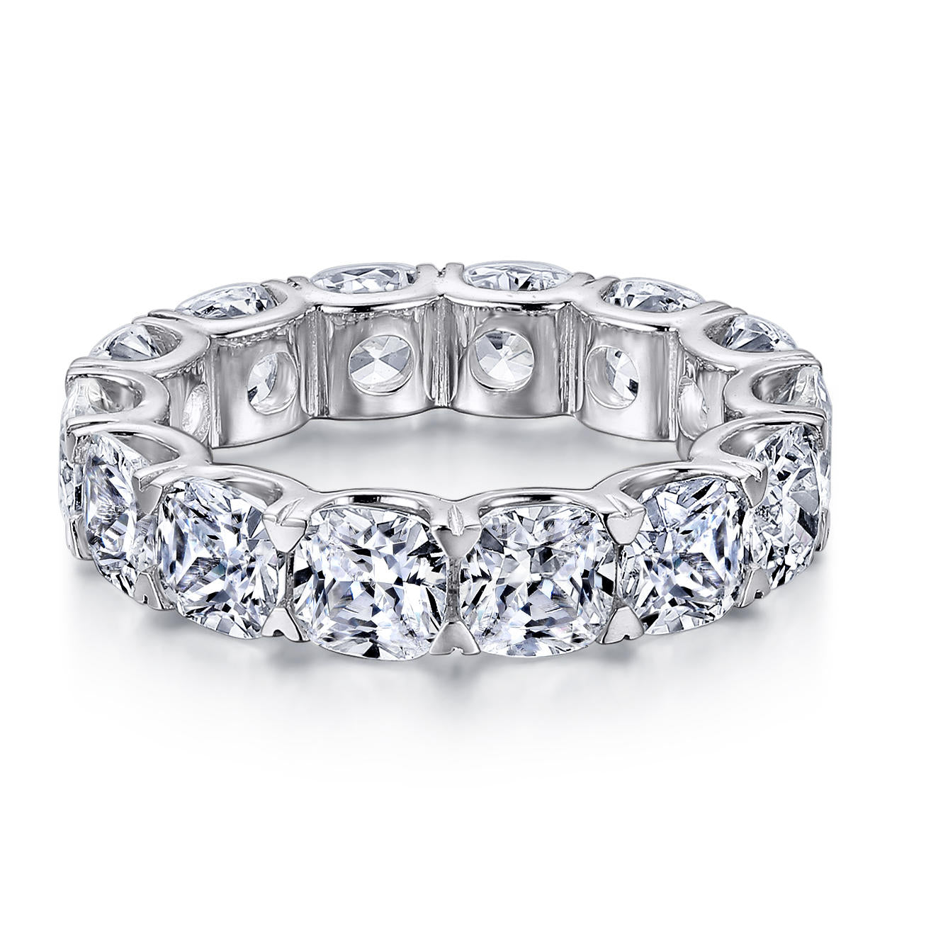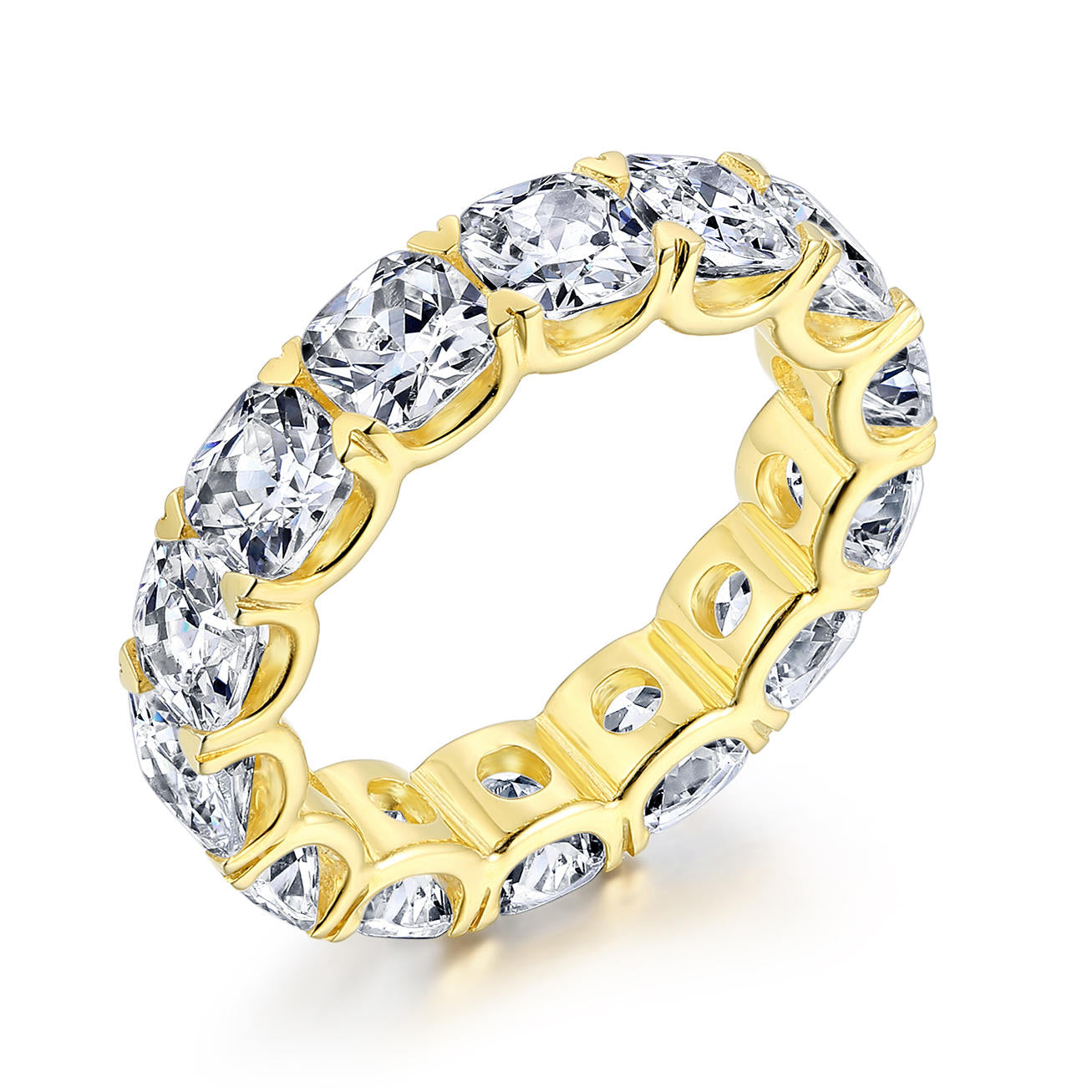 This luxurious cushion-cut diamond eternity band is a breathtaking symbol of everlasting elegance. Featuring approximately 9.80 carats total weight of cushion-cut diamonds, each stone is hand-selected for brilliance and sparkle, set in a continuous row around the band. This eternity ring makes a striking wedding band, anniversary gift, or statement piece.