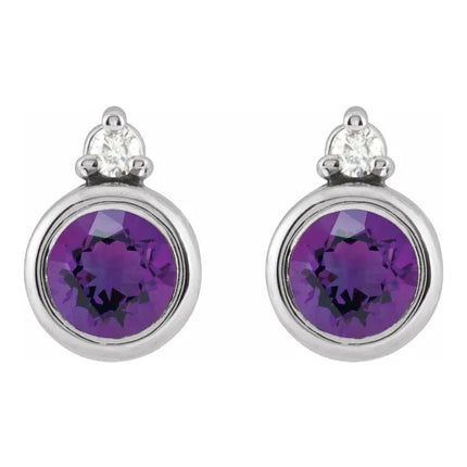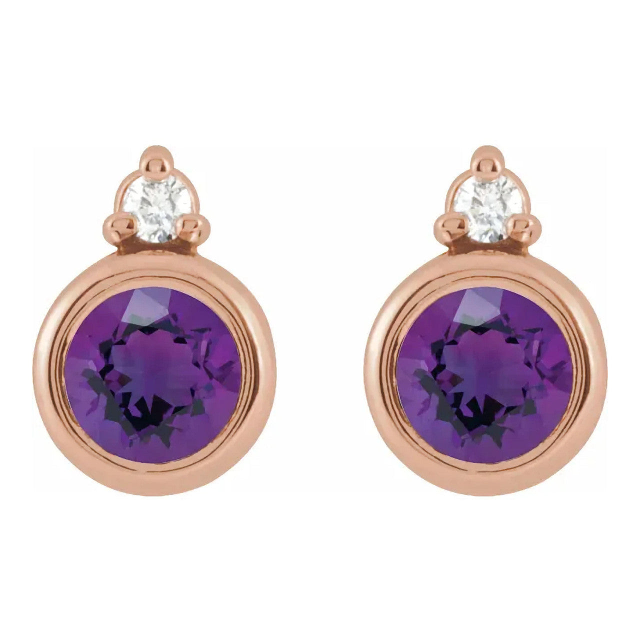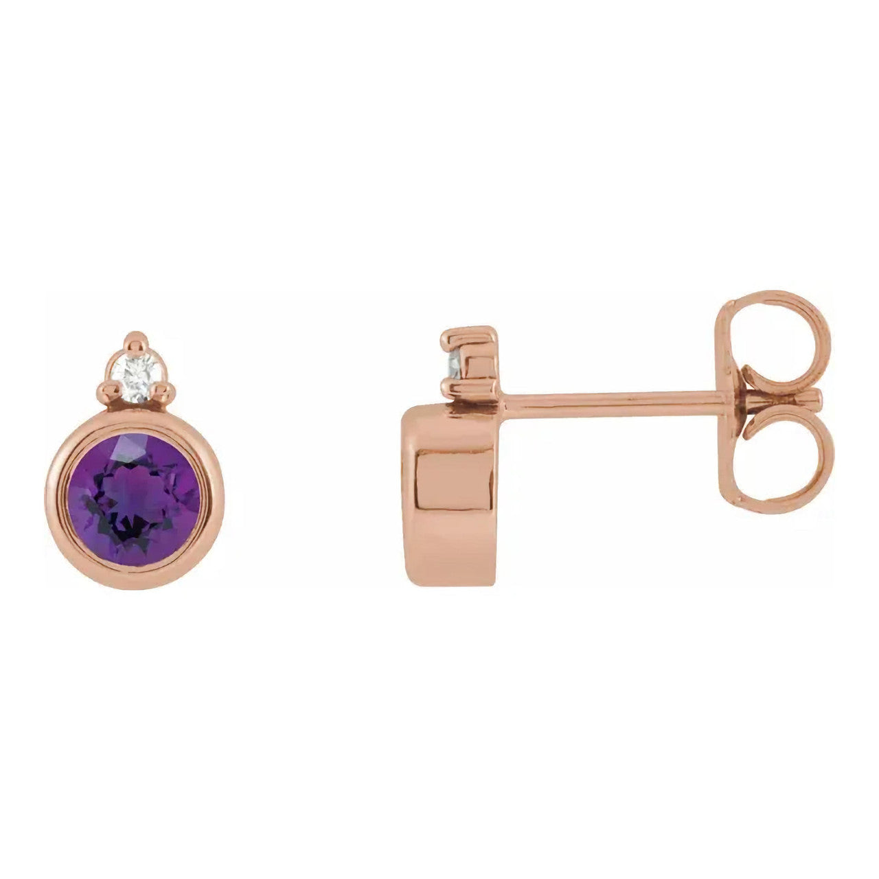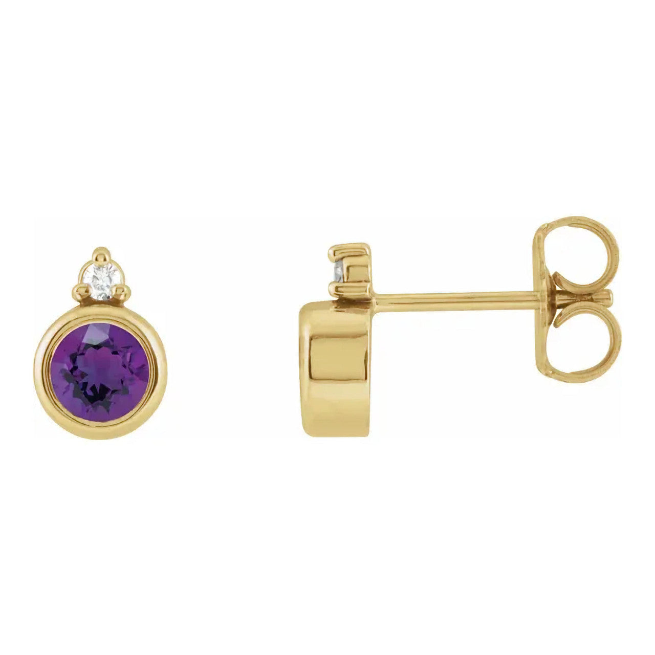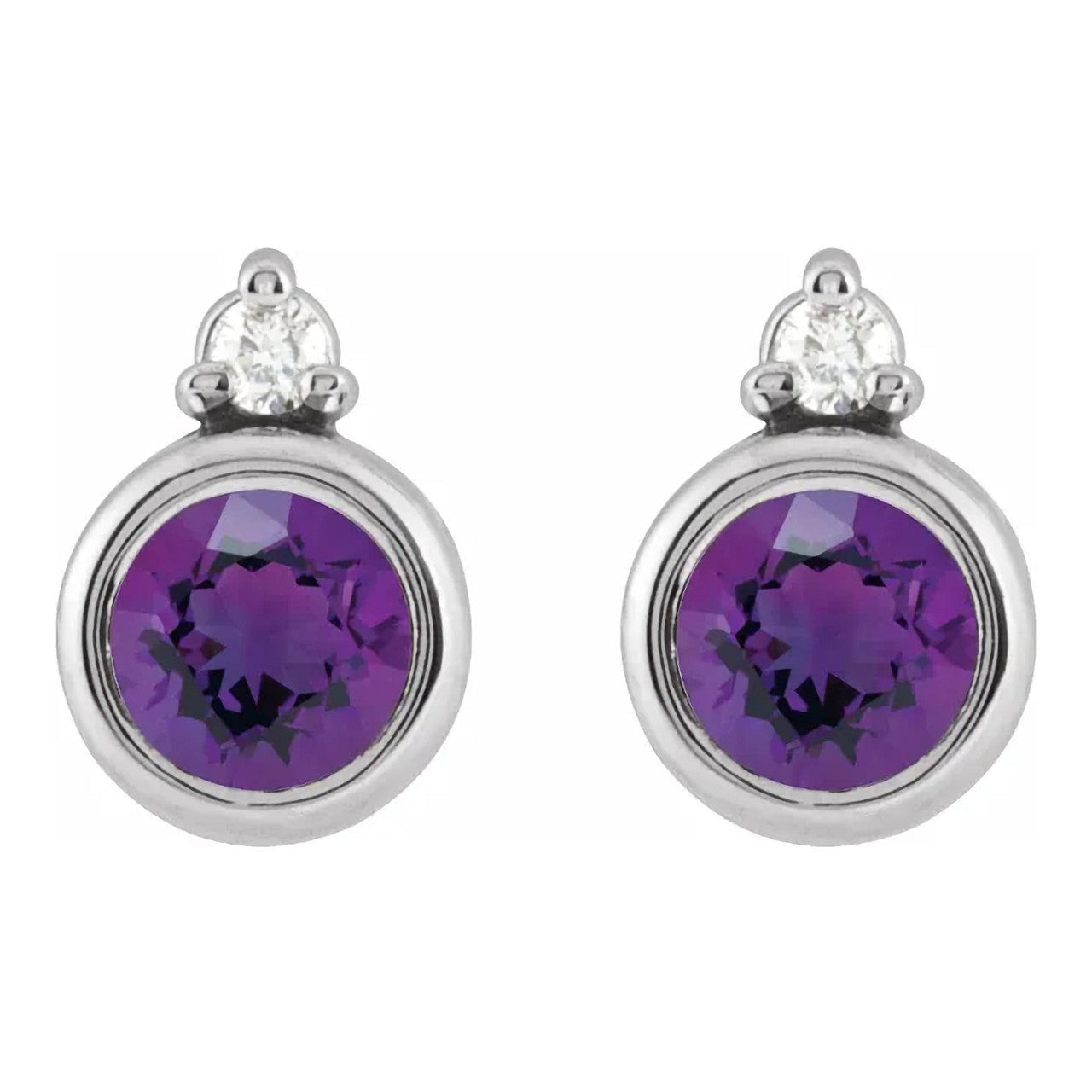 Genuine amethyst & diamond stud earrings. There are 2 round 4mm natural amethysts & 2 round diamonds that are 0.03 ct tw, SI1-2 in clarity and G-H in color set in the earrings. Earring dimensions are 7.6x5.3mm in size and available in white, yellow, and rose gold; as well as platinum. Amethyst is the birthstone of February. Amethyst encourages the wearer humility and wisdom. It was also believed those wearing amethyst would keep their mind clear.