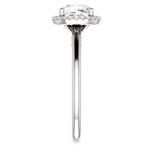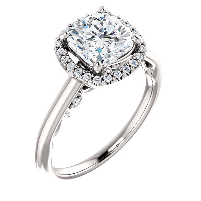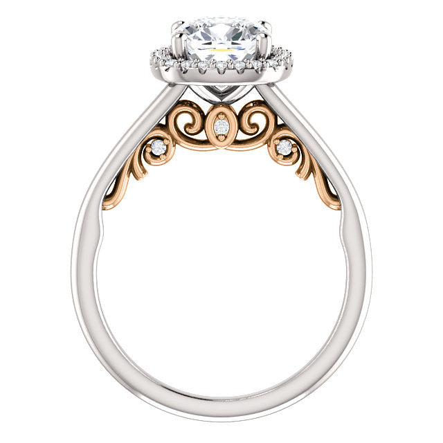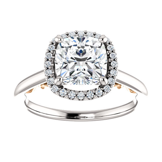 14kt white & rose gold, cushion cut halo diamond engagement ring. There are about 30 round brilliant cut diamonds set around the center stone and the ring. The diamonds are about 0.20 carats total weight, VS1-2 in clarity and G-H in color. Select the shape and size of the center stone. Pictured is a 1.0 carat cushion cut diamond that measures about 7x7mm. This ring is available in yellow, rose, and white gold; as well as platinum.