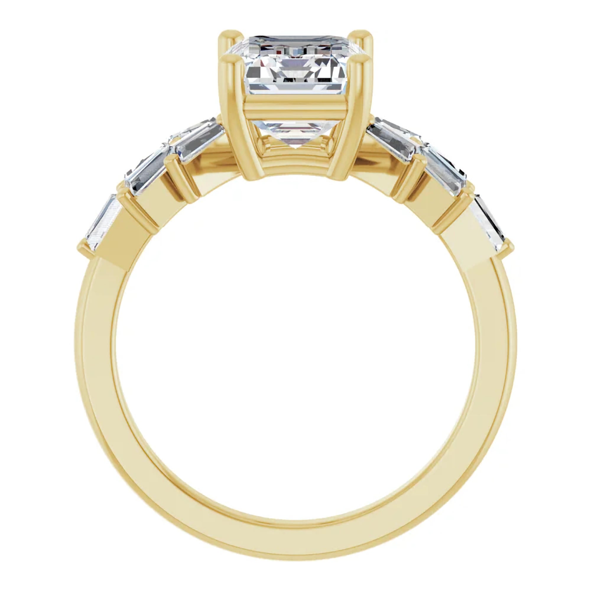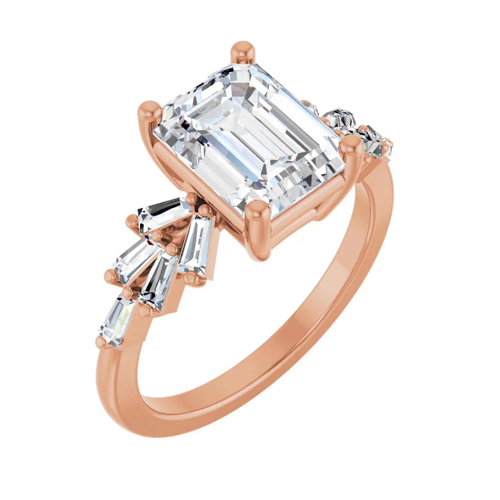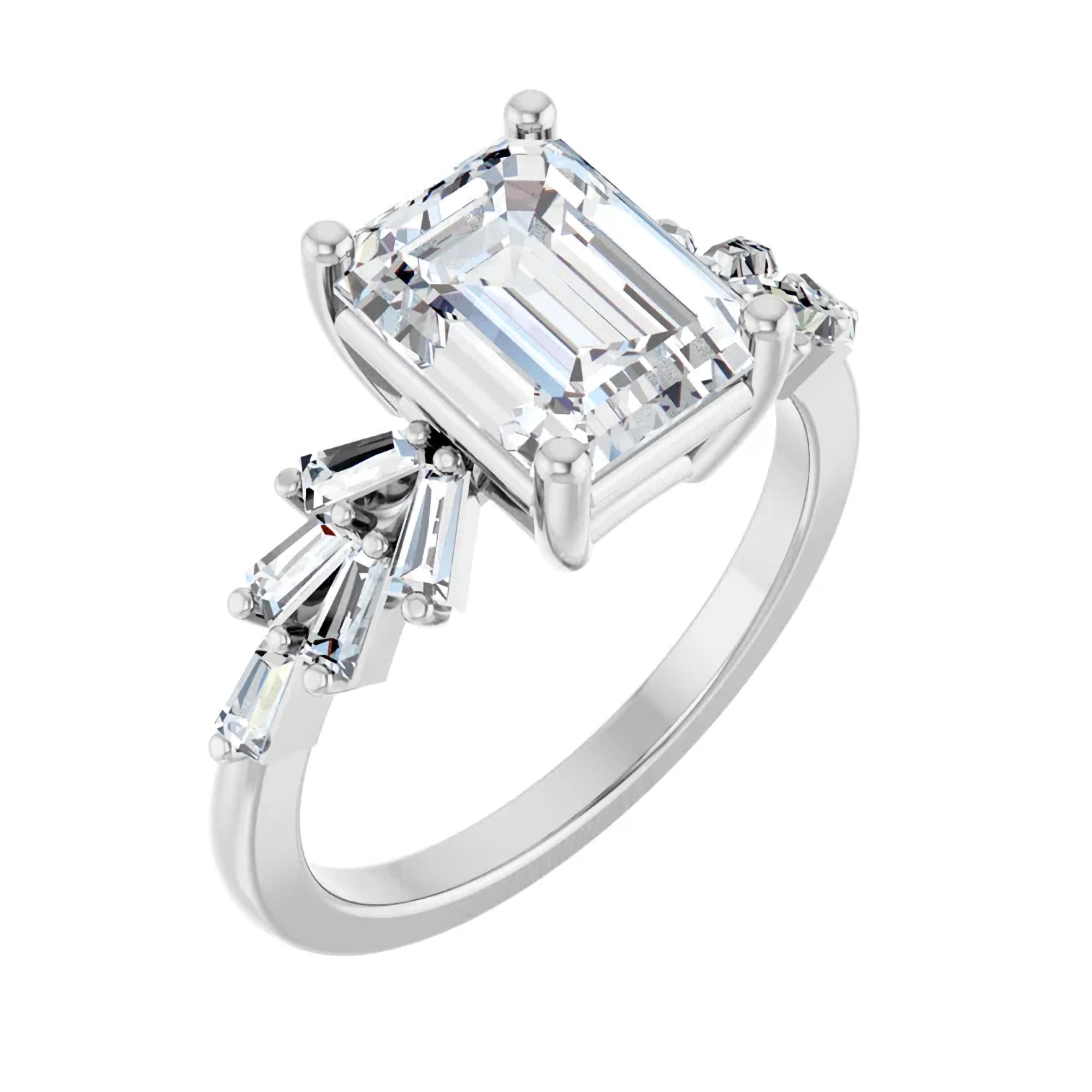 Along each side of the band, baguette-cut diamond accents are arranged in a subtle fan formation, creating a striking contrast to the center stone’s linear geometry. The angled baguettes introduce movement and architectural interest, adding sparkle without overwhelming the emerald cut’s crisp silhouette.