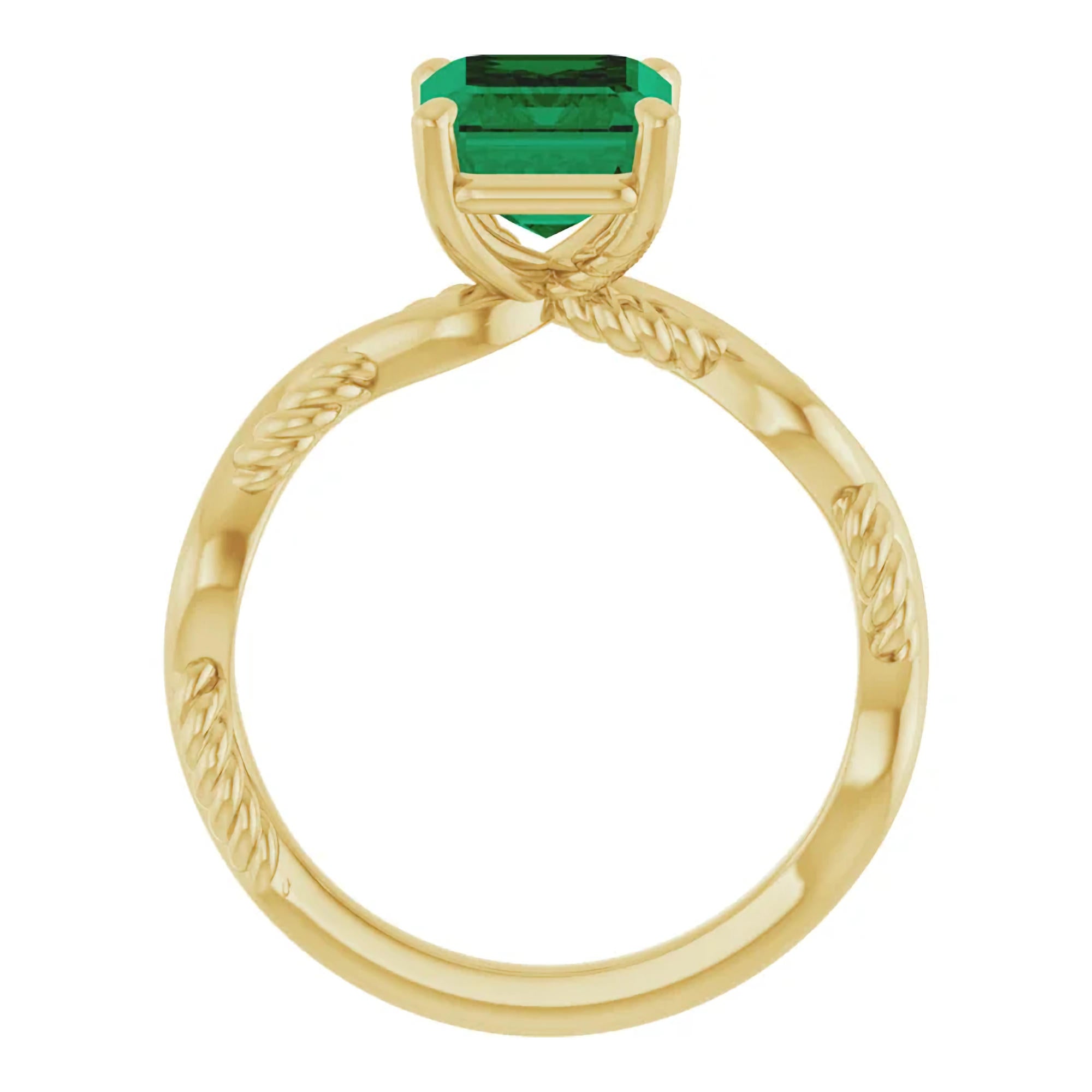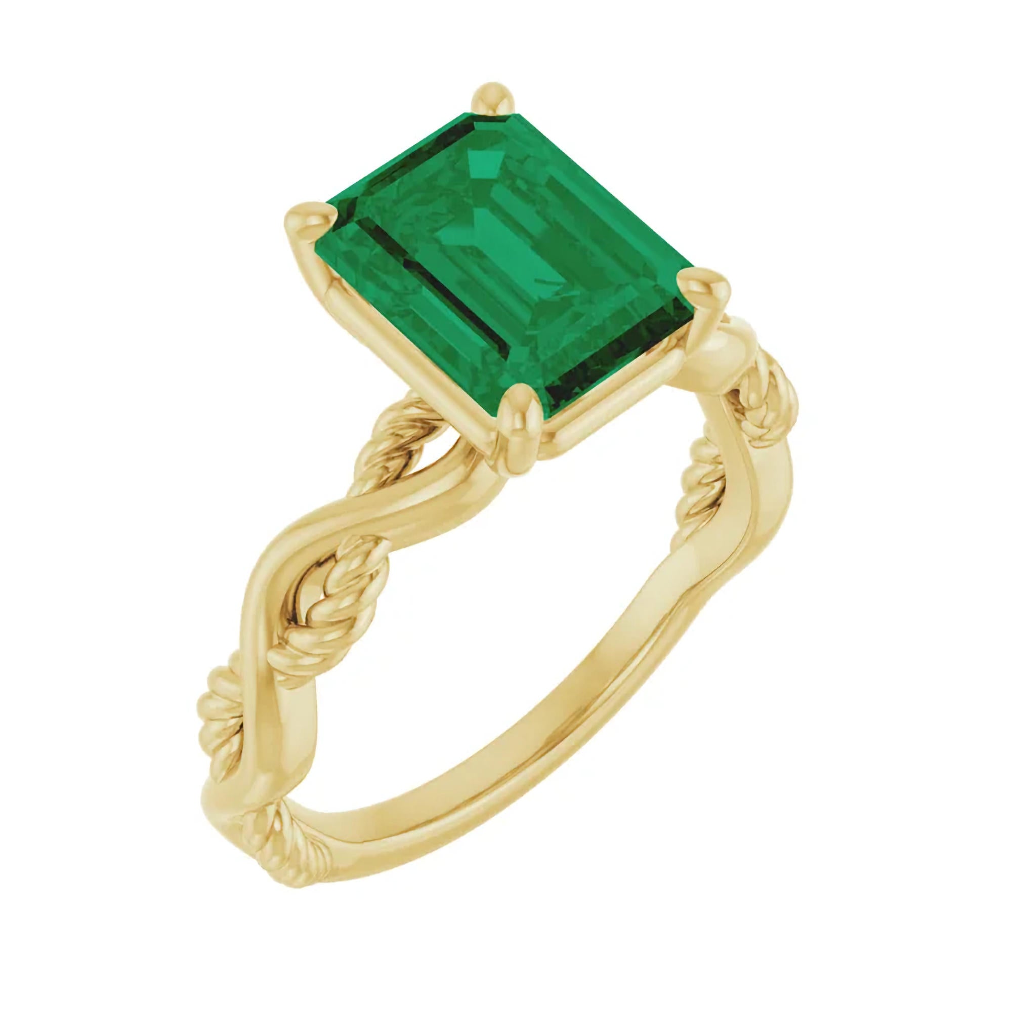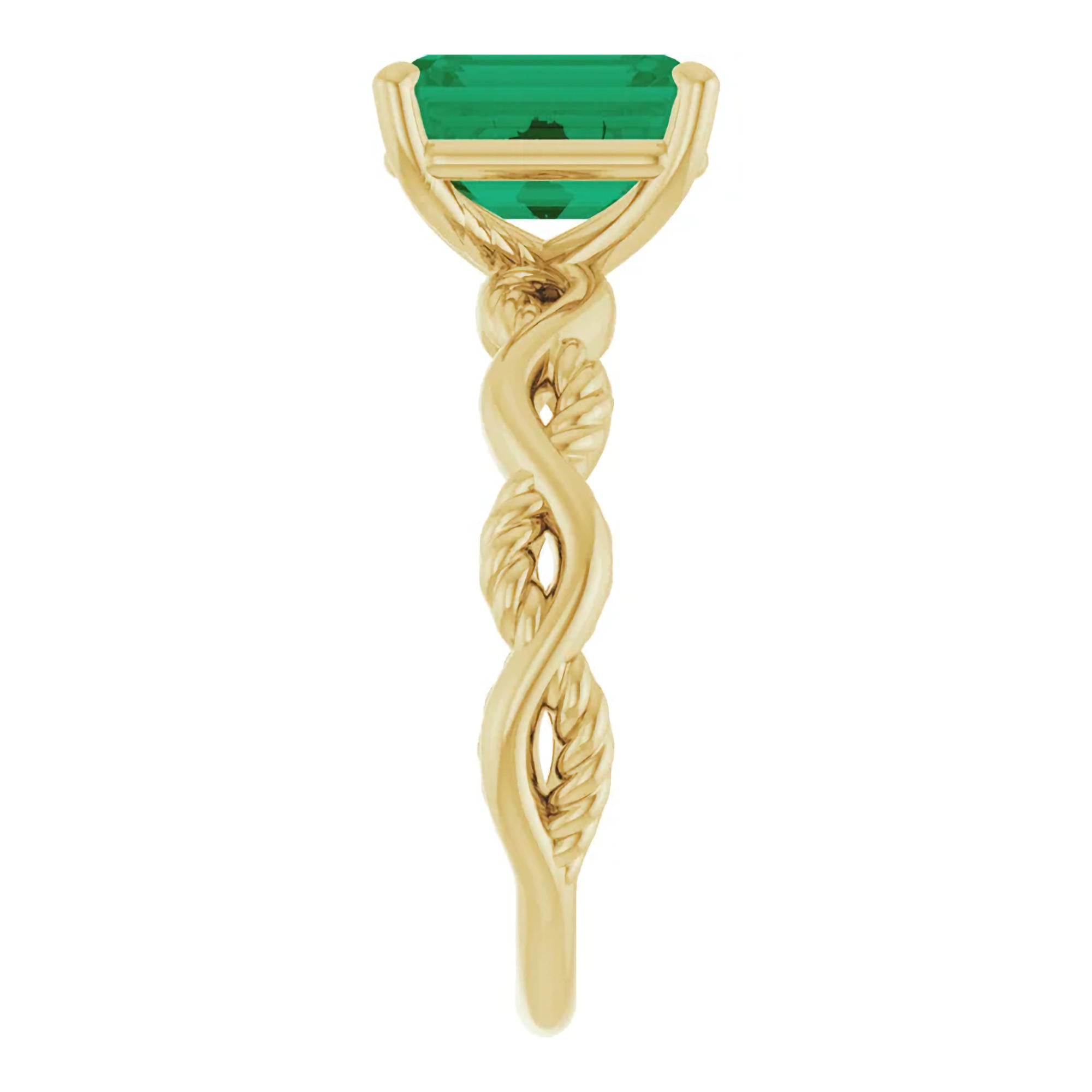 The unique twisted gold band adds dimension and movement, symbolizing the intertwining of two lives while offering a modern twist on a classic solitaire. The emerald is secured in a timeless four-prong setting, allowing maximum light to enhance the stone’s depth and brilliance.