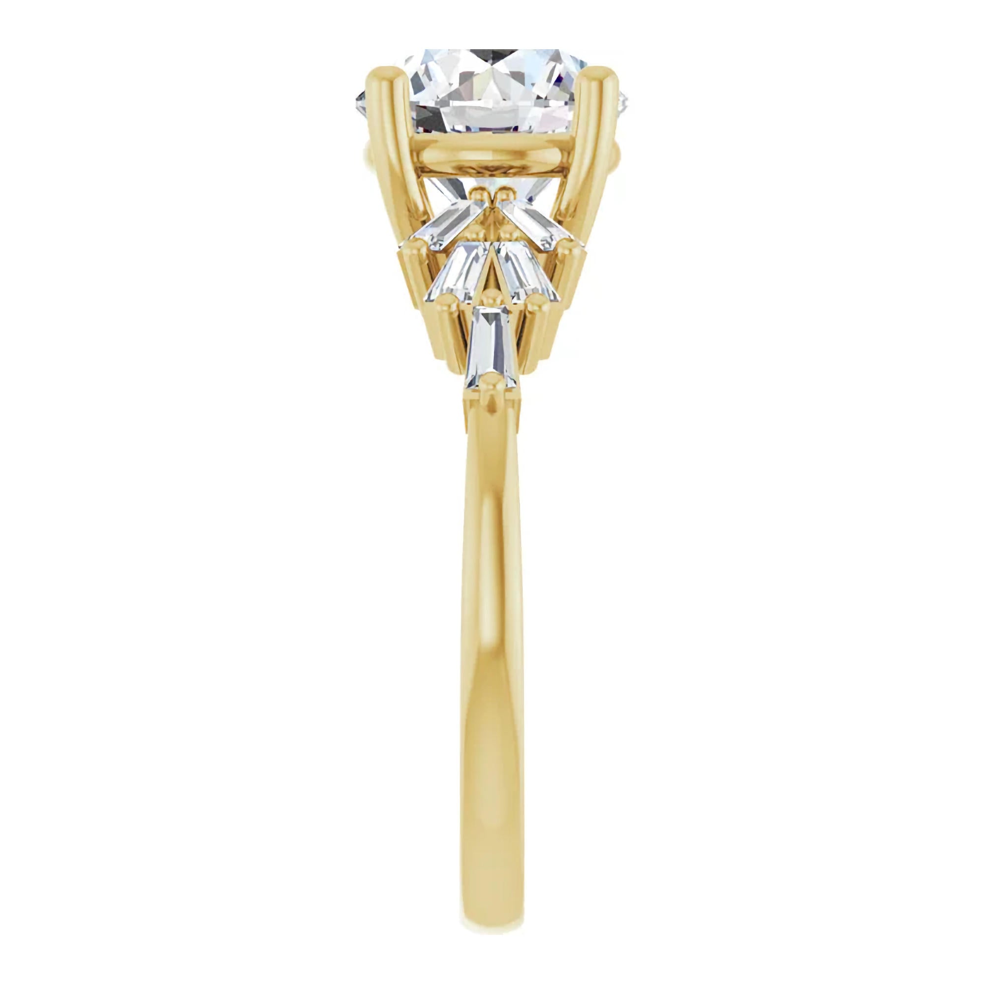Each baguette is individually set at varying angles, forming a dynamic contrast against the smooth, polished shank. This asymmetrical composition draws the eye diagonally across the ring, emphasizing the center stone while adding depth and visual intrigue from every angle.
