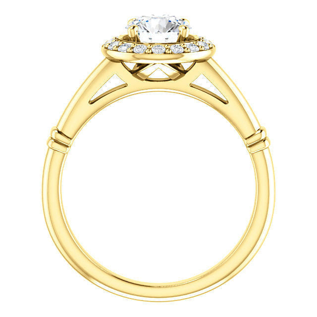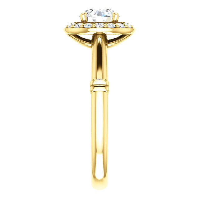 This 14K yellow gold round halo diamond engagement ring is a timeless symbol of love and elegance. Featuring approximately 16 round brilliant cut diamonds totaling 0.16 carats, the halo enhances the brilliance of the center stone with radiant sparkle. The accent diamonds are graded SI2 in clarity and H in color, creating a balanced combination of beauty and value. The design allows you to select the size and shape of your desired center stone, with diamond count and halo weight varying accordingly. Weighing approximately 4.30 grams in a size 6, this ring offers classic style with customizable options, making it a perfect choice for your engagement.