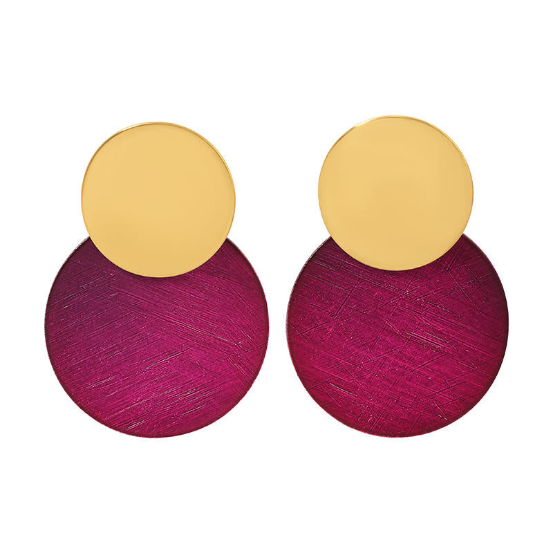 Bold color meets refined craftsmanship in the Royal Merlot Circle drop earrings from Frederic Duclos. Designed in sterling silver with luminous 14K gold plating, these statement earrings feature a polished gold disc paired with a richly textured merlot-hued circular drop for striking contrast and modern sophistication.