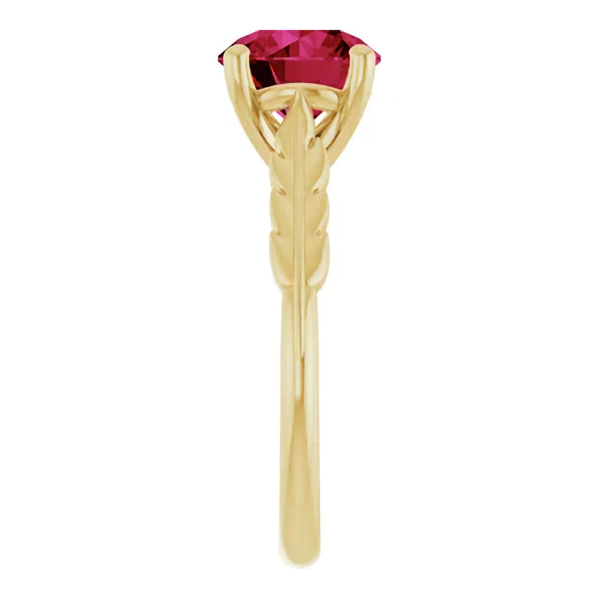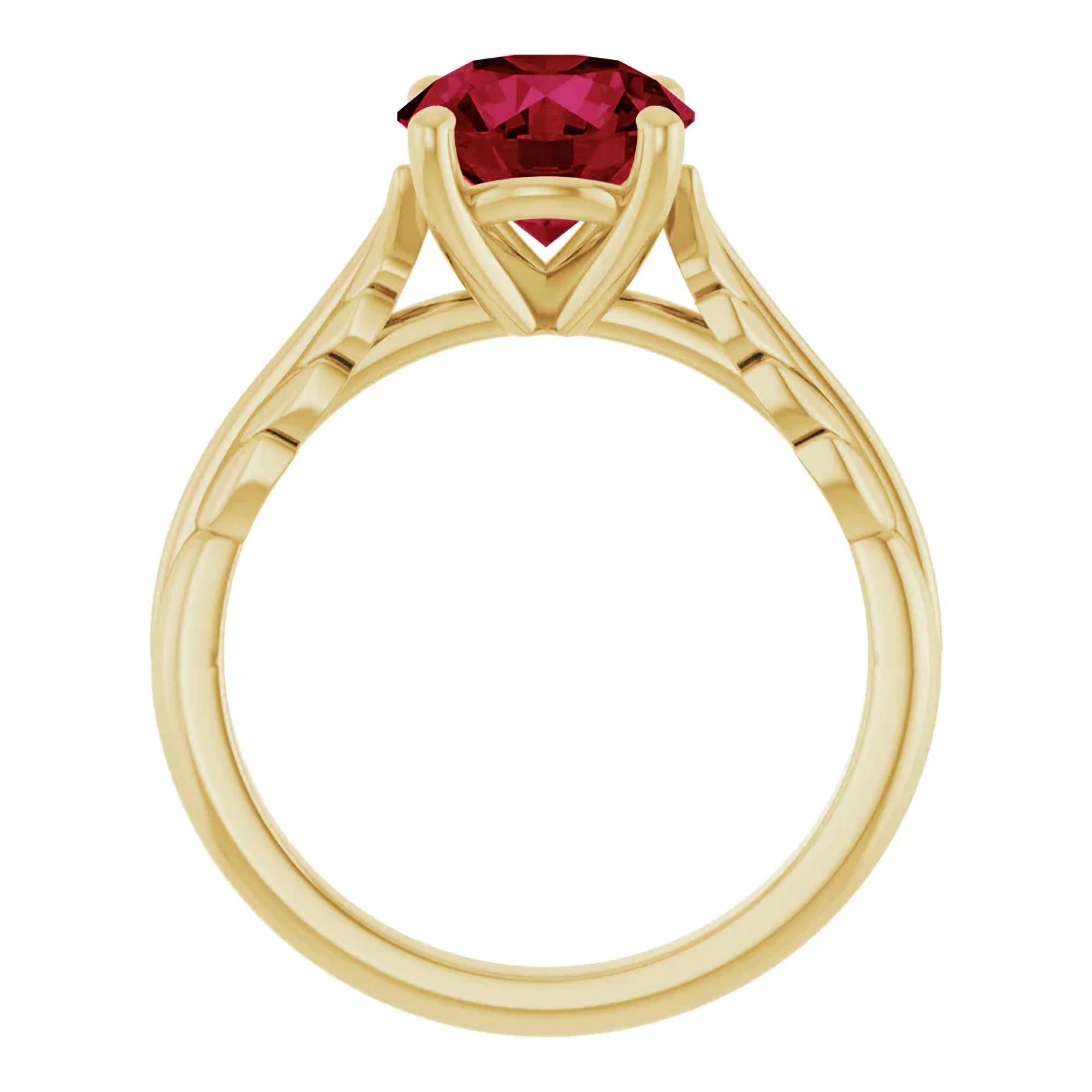 Radiant and romantic, this round ruby solitaire engagement ring is crafted in gold, showcasing a vibrant ruby at its center. Known for its rich red hue and powerful symbolism of love and passion, the ruby brings bold beauty to this classic solitaire design.