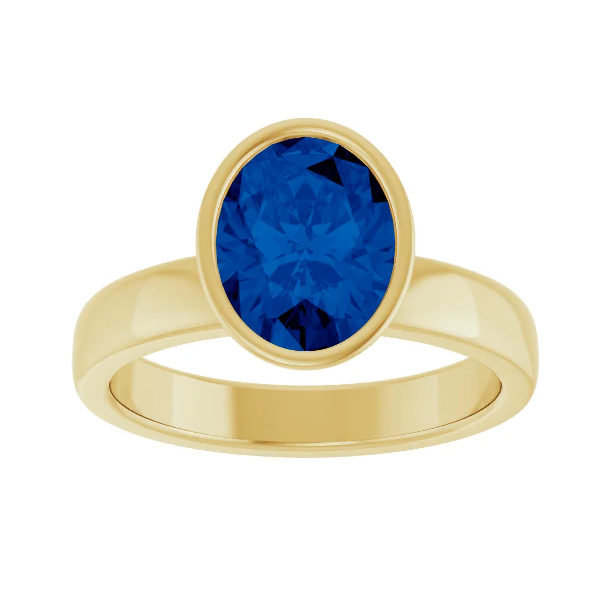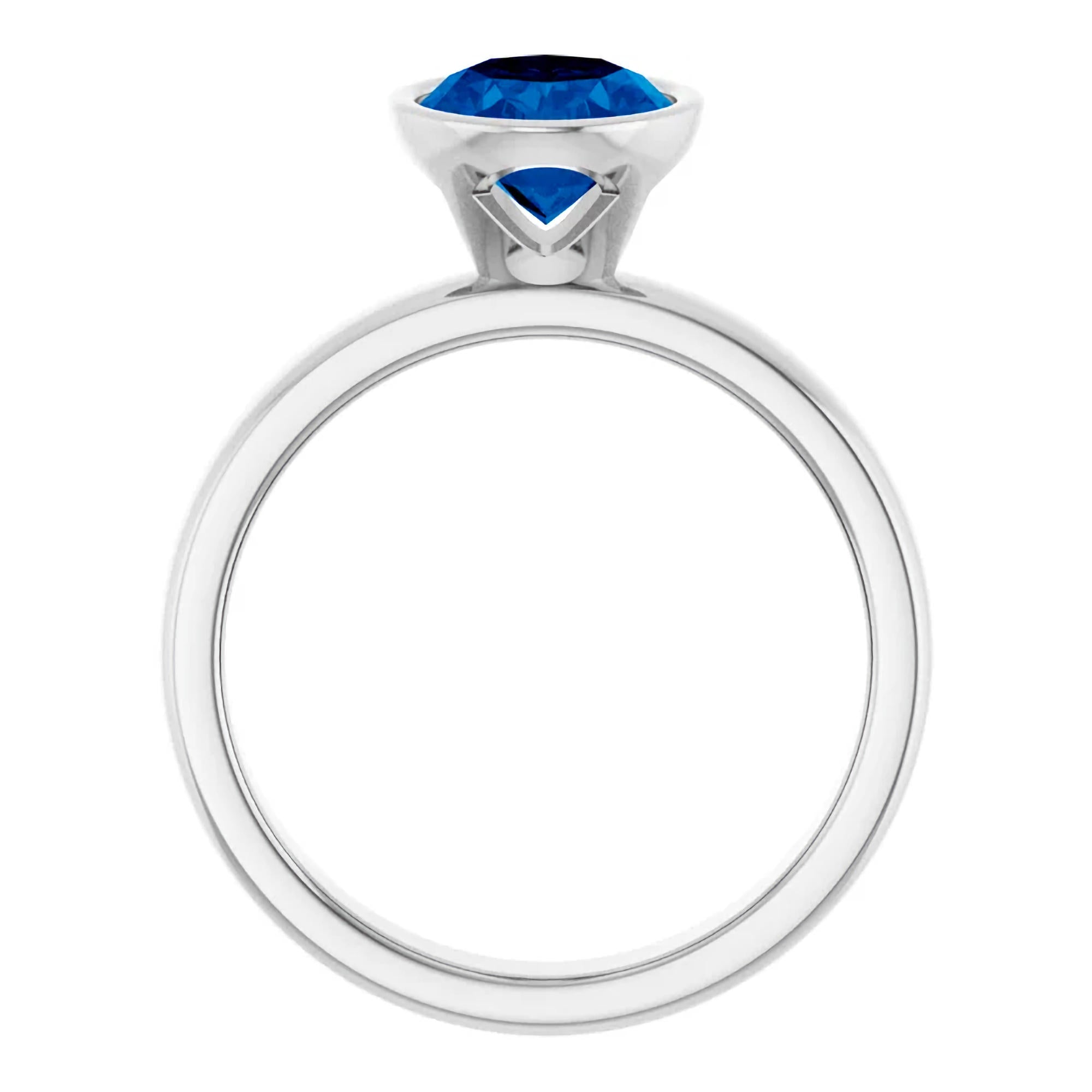 Elegant and enduring, this oval blue sapphire solitaire engagement ring is a clean, modern look. The center sapphire displays a rich, deep blue hue, beautifully framed in a smooth bezel-style solitaire setting that enhances the stone’s color while offering a refined, contemporary profile.