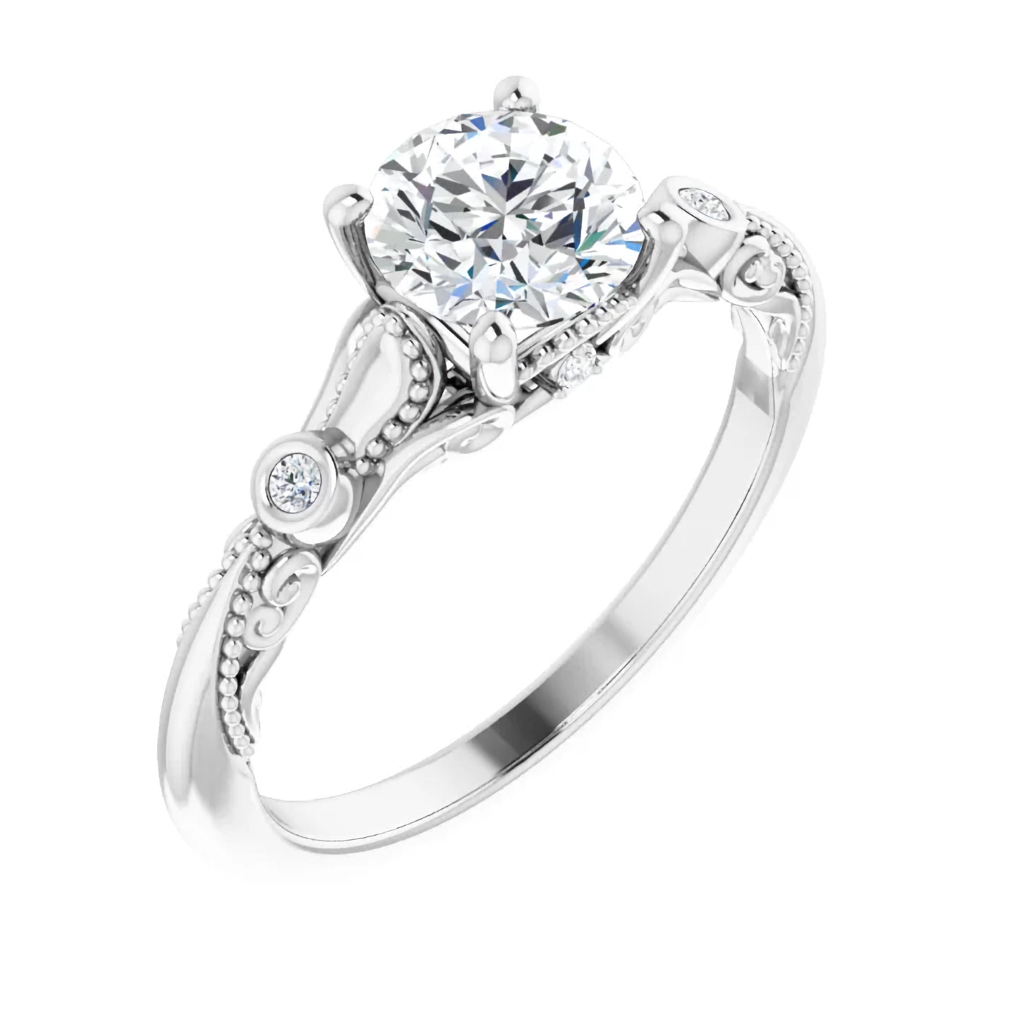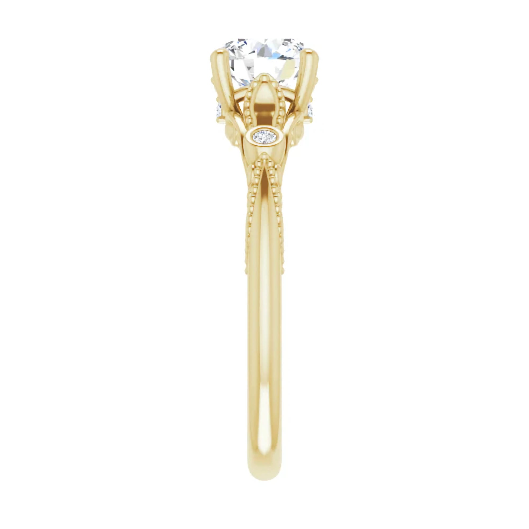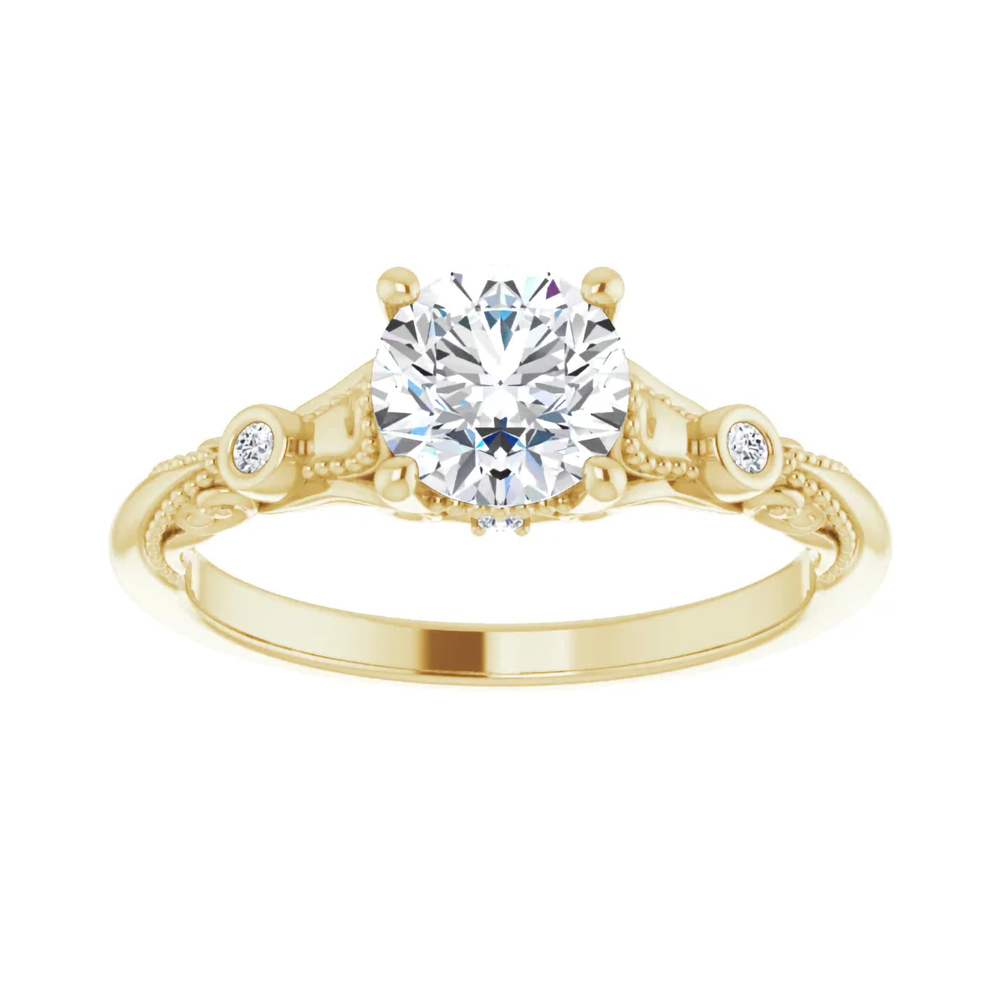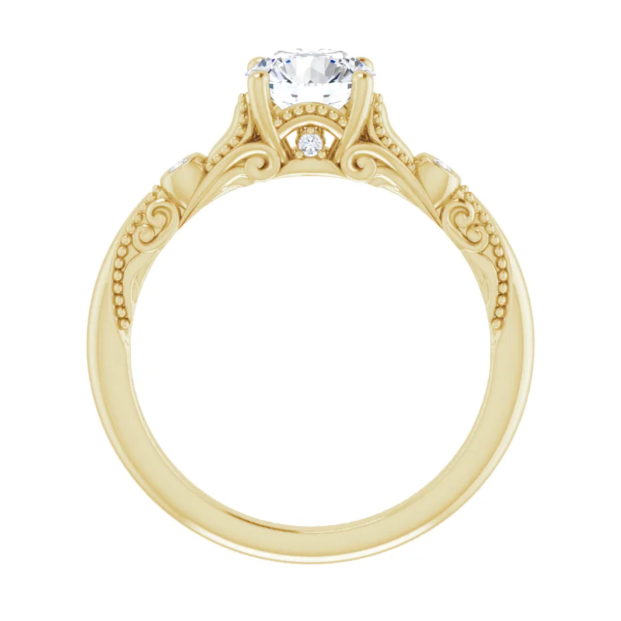 This vintage-inspired round diamond engagement ring is rich in detail and timeless elegance, designed to celebrate craftsmanship as much as brilliance. Every element of the ring is thoughtfully composed to evoke the romance of heirloom jewelry while maintaining a refined, wearable silhouette.