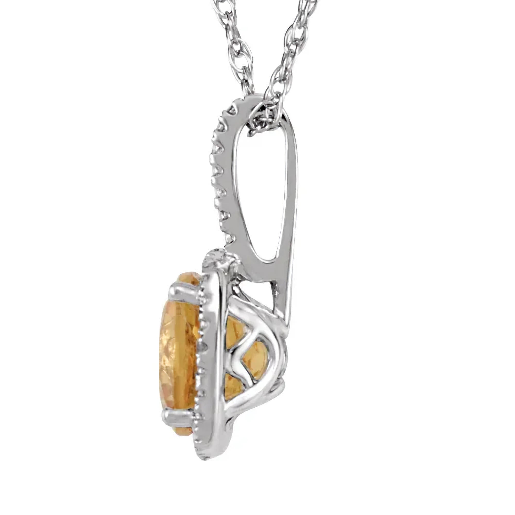 Bring a warm golden glow to your neckline with this citrine and diamond halo pendant necklace in sterling silver. The vibrant round citrine gemstone, November’s birthstone, shines at the center of a brilliant diamond-accented halo, adding sparkle and sophistication to any outfit.