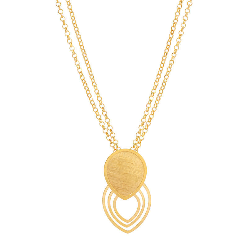 The textured upper element offers an artisanal, hand-finished feel, while the open echo design beneath creates depth and light-catching brilliance. Suspended from a delicate gold-plated chain, this pendant strikes the perfect balance between bold statement and refined wearability.
