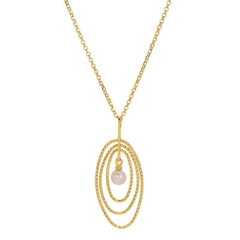 Graceful movement and modern elegance define this oval freshwater pearl drop necklace from Frederic Duclos. Crafted in sterling silver and finished in radiant 14K gold plating, this design features layered open oval silhouettes that create dimension, texture, and refined sophistication.