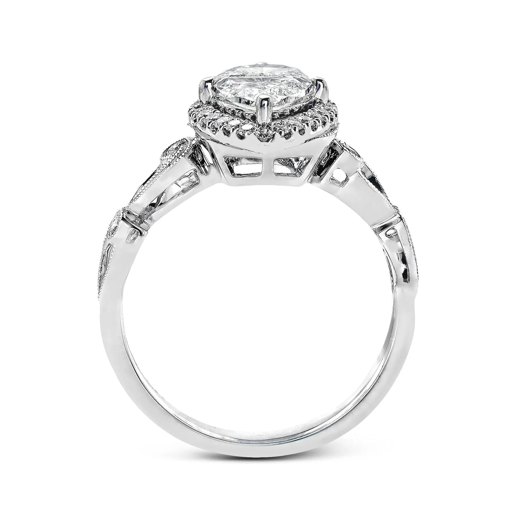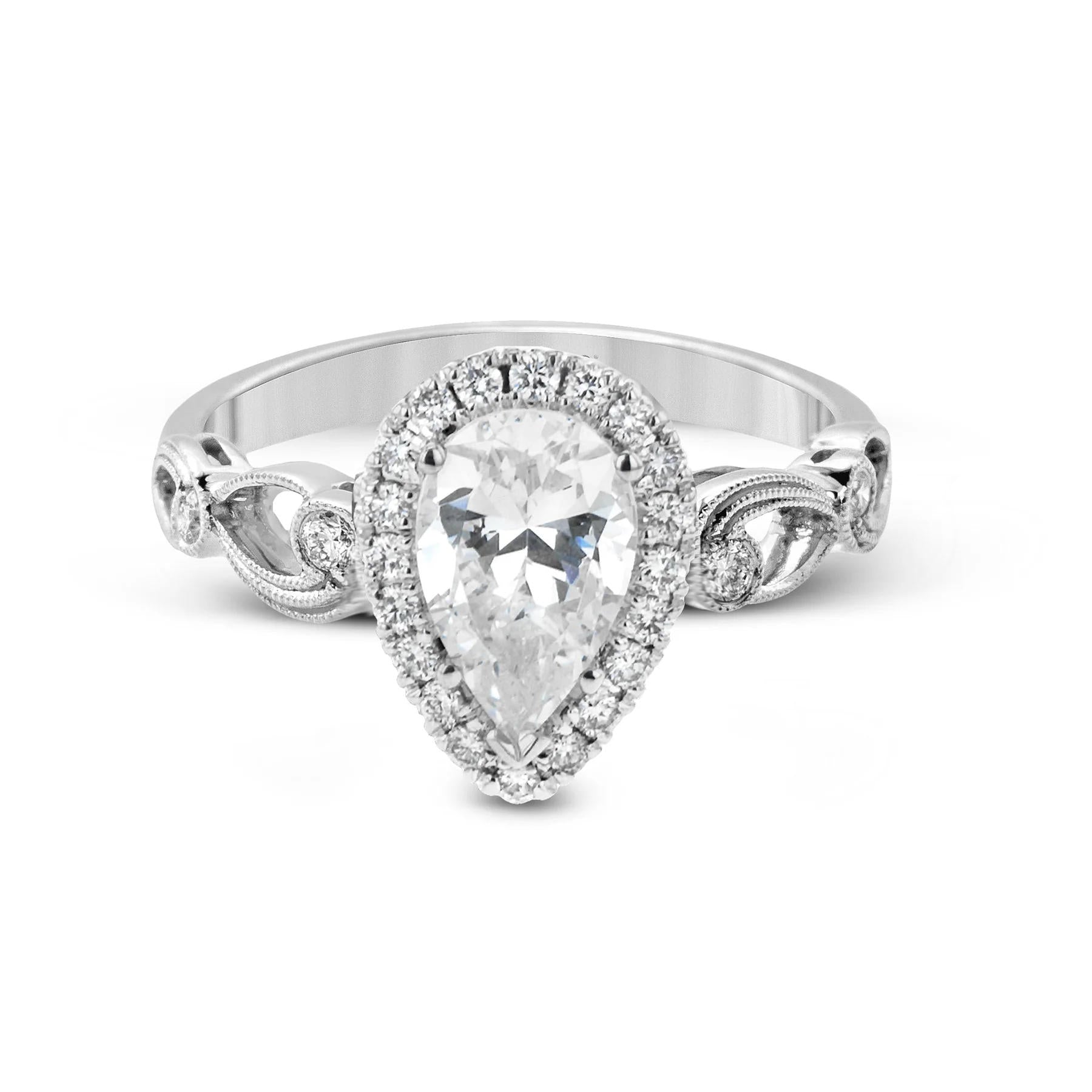 Pear-cut vintage inspired diamond halo engagement ring. There are approximately 36 round naturally mined, conflict-free diamonds set that are 0.16 carats total weight, VS1-2 in clarity and G-H in color. Diamond total weight and count may vary depending on the center stone. There are milgrain designs around the ring. Select the size you want in the center. This ring is available in white, yellow or rose gold; as well as platinum.